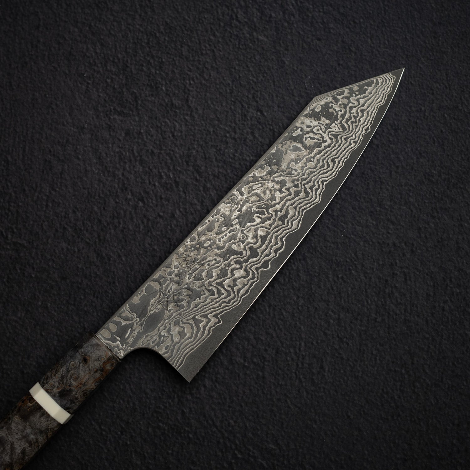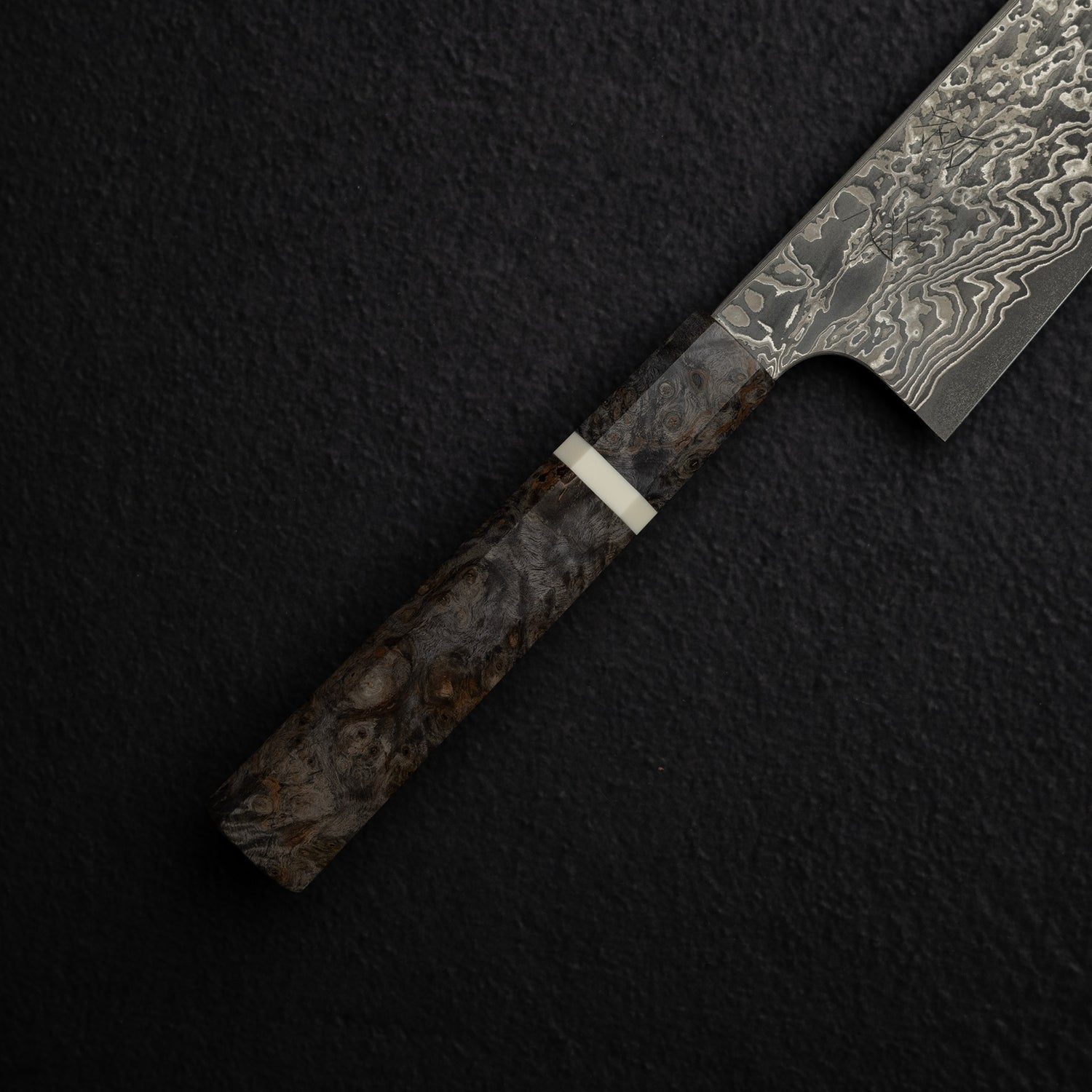 A special item from Hatsukokoro (and Nigara): a suminagashi pattern Damascus K-tip Gyuto 210mm with SLD core. Comes with the elegant stabilized birch burl handle.