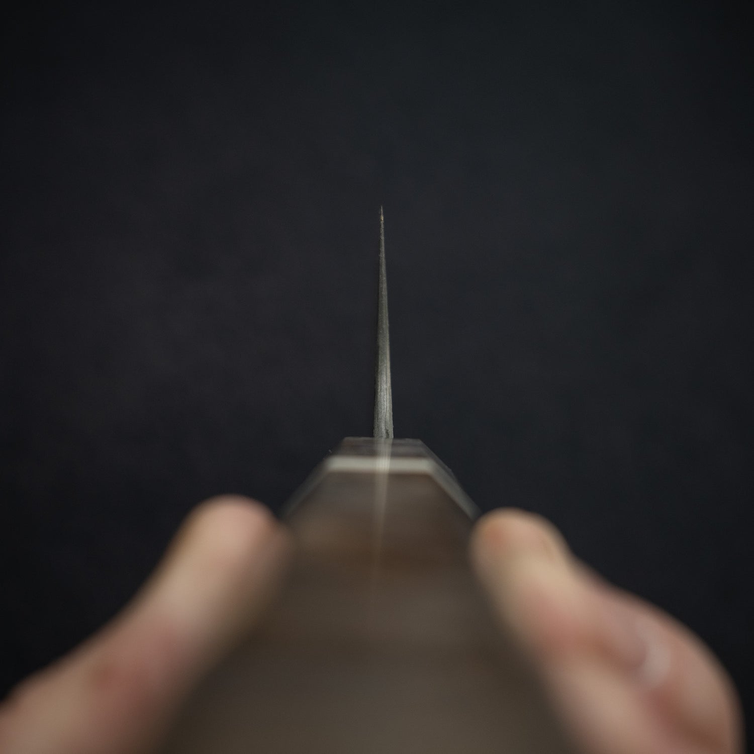 Nigara usually has the Yorokobi SP line with a half polished blade (with KU finish left), however this specific example is a more classic version with the entire body polished. The thinner blade enables an even better food penetration.