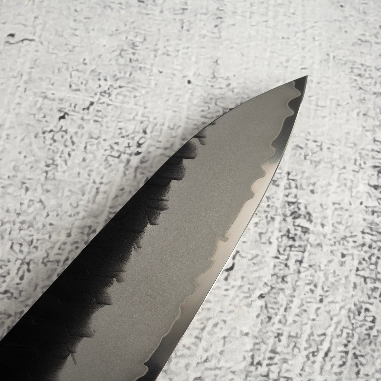 The Kurouch Tsuchime is a combination of the raw, organic black finish and the characterful hammered Tsuchime finish. It is commonly seen as the Kurouchi finish will keep the original black scale of the billet unpolished after forging, the texture from the forging process will be also kept, allowing all kinds of patterns and indentations to be introduced to the blade. As a combination of Kurouchi and Tsuchime, this finish also inherents their benifits: reduce drag, help with food release and protect the steel from rusting. Over all Kurouchi Tsuchime is a practical and esthetically unique finish.