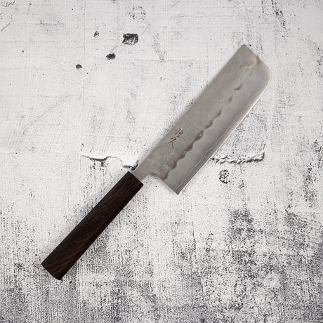 Hatsukokoro Ginsan Damascus Tsuchime Nakiri 170 mm with Teak wood Handle, by Yoshihiro Yauji