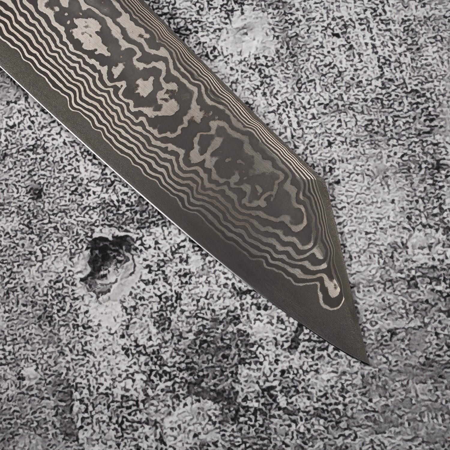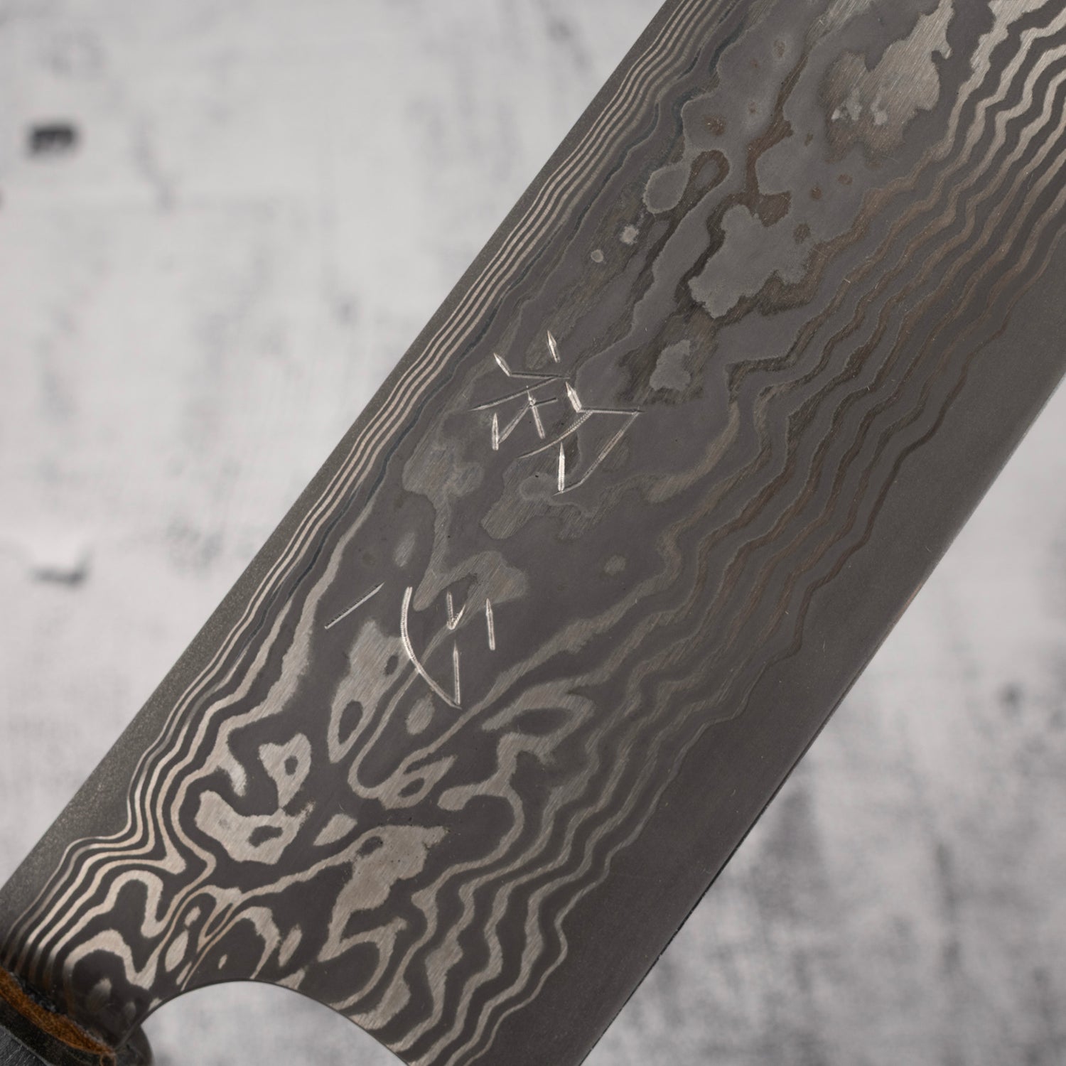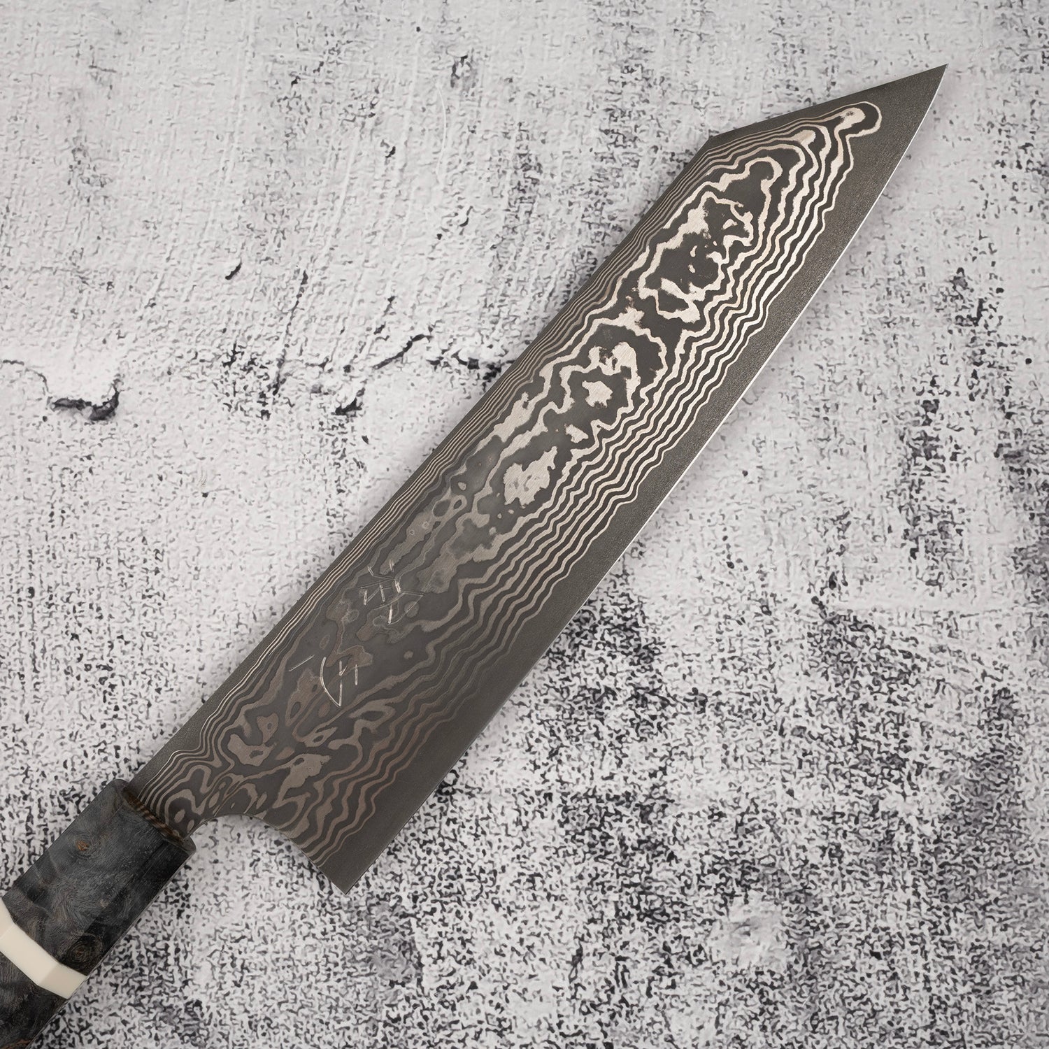 The eye-catching Damascus pattern layed over the Kurouchi finish is probably the most eye-catching feature that grabbed your attention. Unlike most of the Kurouchi finish we see, the oxidation layer on these knives are very dark, It is likely achieved by etching like the Yorokobi SLD line. In contrast, the silver Damascus pattern pops off strongly over teh dark surface, which reminds me of the now-nearly-impossible-to-obtain "River Jump" Tanryusen by Tsukasa Hinoura. I would assume that these knives actually undergone similar process, where the more reactive metal in the Damascus is etched away, leaving the high nickel metal protruding out above the surface, which allows them to be polished after a darker layer of oxidation formed during the heat treating. As these black crust are quite darker and thicker than the typical Kurouchi finish, additional etching are likely done after the polishing to further increase the contrast.