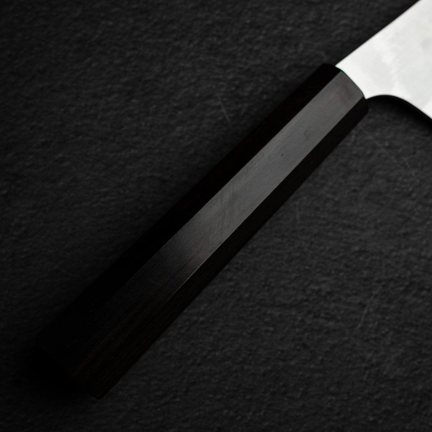 The Gekko is a series of knives forged by Master Yu Kurosaki that shines just like its name "Moonlight". These blades look plain and simple from afar, but they will reveal their beauty when examined up close: the bevel is finished with a uniform high grit Migaki finish, where the rest of the blade has a dotted yet polished texture. This finish soften the light, but it is not as rough as a Nashiji finish. Subtle, elegant and poetic, it wouldn't be hard for someone to relate this look to the bright moon in the sky when examine Gekko under a spotlight.