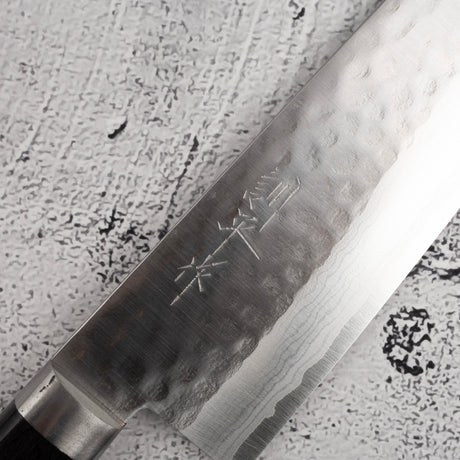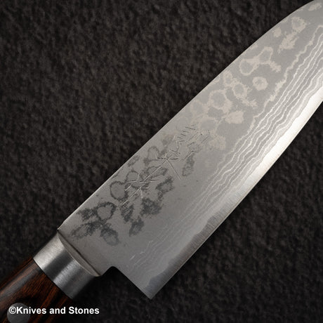Hatsukokoro Hayabusa VG10 Damascus Tsuchime Santoku 180mm Ebony Handle