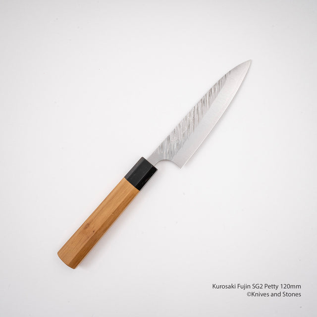 The Kurosaki Fujin has a unique diagionally forged tsuchime (hammered) pattern by Kurosaki called 'Fujin' (Wind of the God). The visual is highly appealing, combined with Kurosaki's excellent cutting performance, and a rare SG2 powdered steel, this variant is highly sought after. Kurosaki raised to fame with three signature hammered patterns: the Shizuku, Fujin and Raijin. In recent years, there have been very little production of these three lines and due to the high demand of Kurosaki??s work, they are seldomly available. We recently received a small batch of the Fujin, and while the initial bathes were in Aogami Super, this batch of Fujin is the more desirable Takefu powdered SG2.
