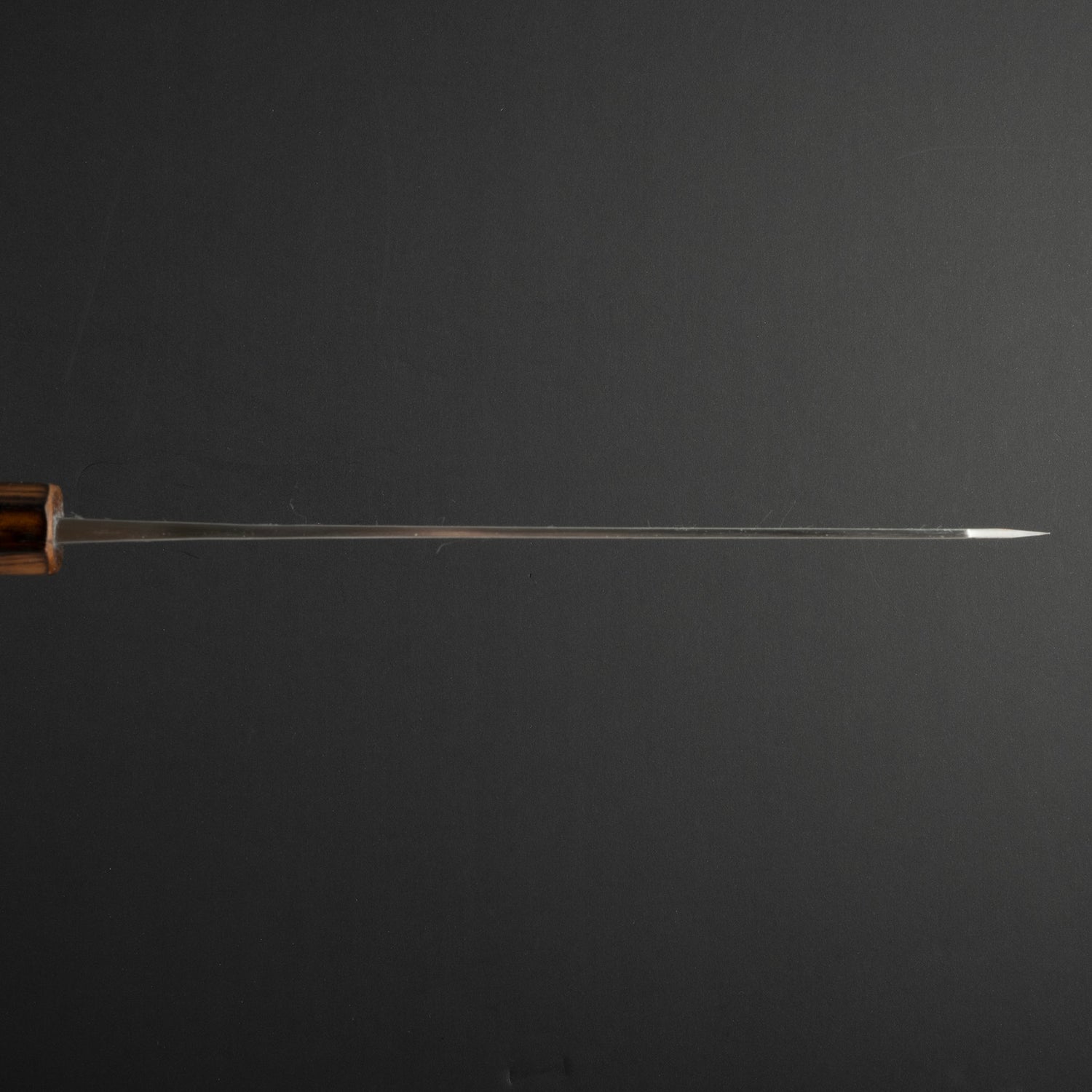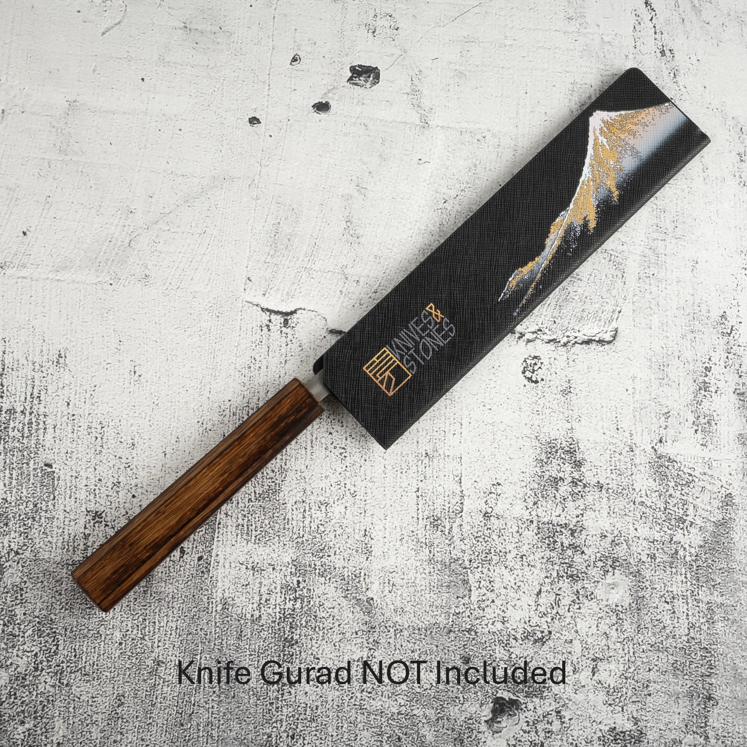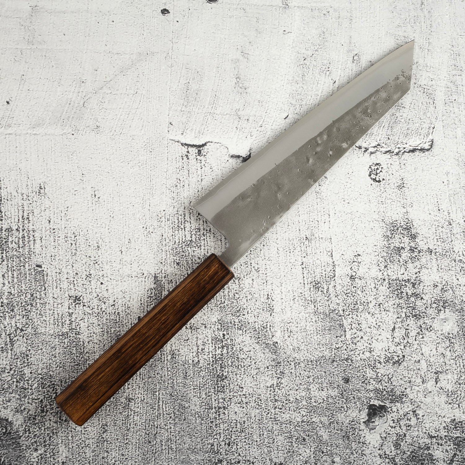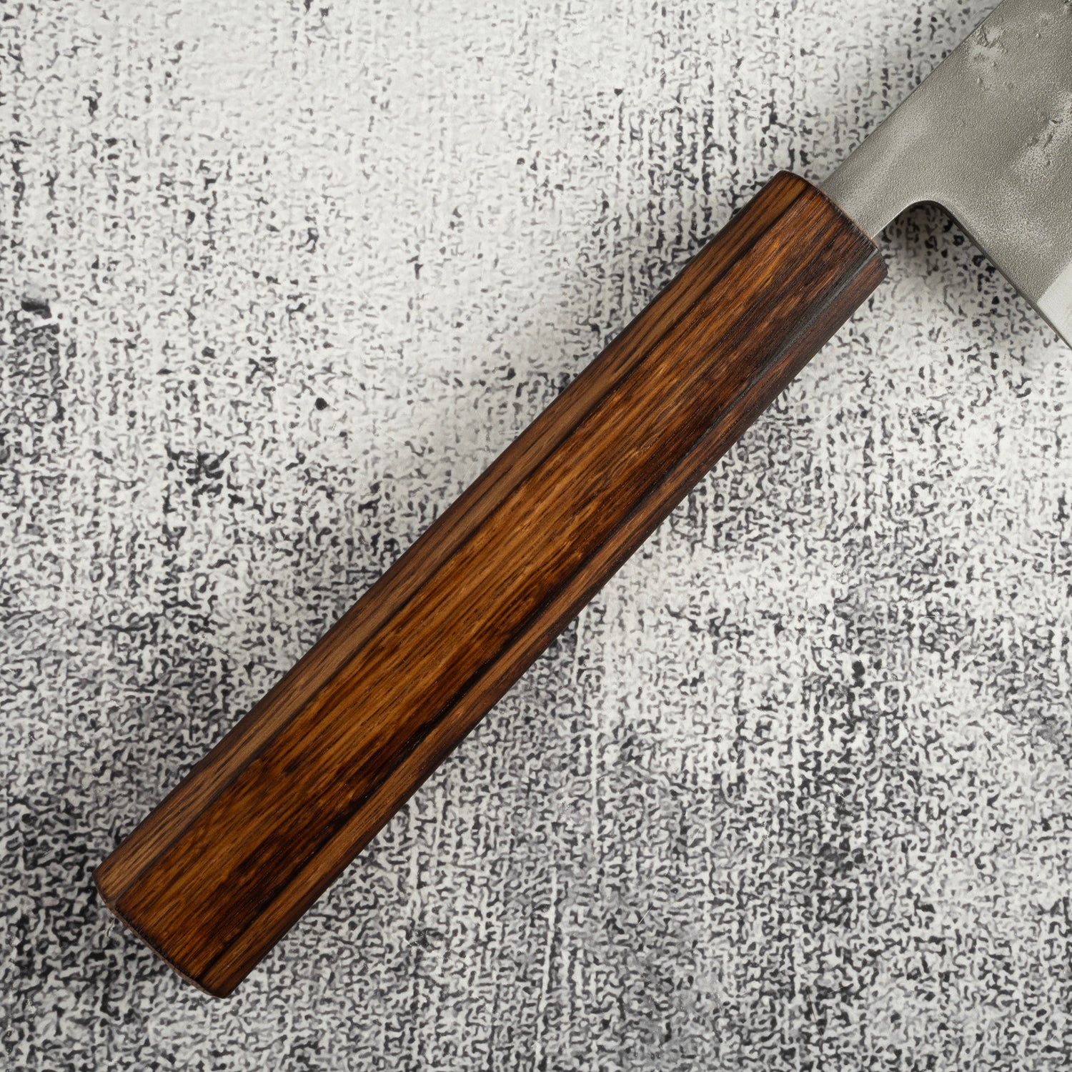This is a very Sanjo knife under a Sakai brand, and I quite recommend it for users who like that reassuring weight from a heavy knife. The hand forging, rustic Nashiji finish and smooth hand sharpening lead to a very characterful lineup. It is a great line to work with for professionals or knife enthusiasts with its great cutting characteristics.