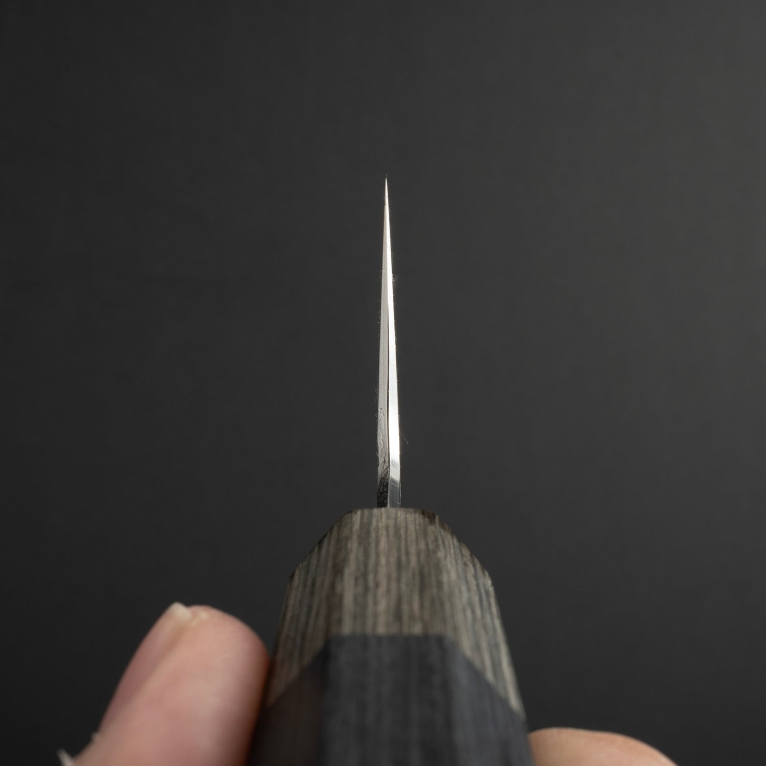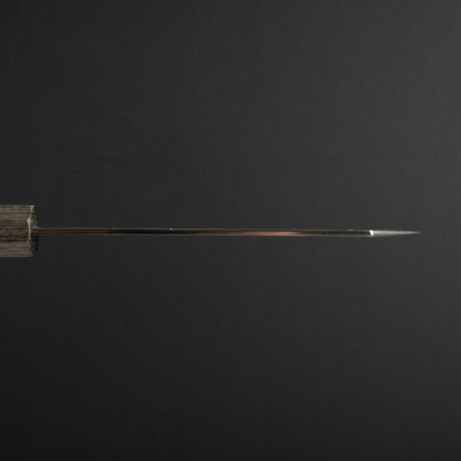Typical Sakai approach in knifemaking would begin with a forged blade with intermediate thickness, sharpening in a lightly convex geometry where the bevel transitions smoothly to the Hira. After the finishing polish using a wooden wheel or sandblaster, the Kasumi finish would look like a uniform surface from the side. Hado took a very different approach in their knife design, staring with a slightly thinner blade that measure just above 2mm in the spine, they put a very aggressive bevel onto the blank, the Shinogi line is clear and defines, located close to the spine, which means a lot of material are removed and the bevel stays thin until very high up. This means minimal wedging in cutting even if you are dealing with a tough produce, and the sticking issue is solved via a subtle convex grind behind the edge.