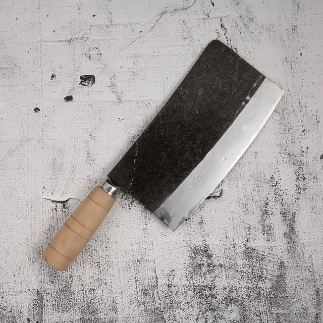This Sentan is our answer to this blind spot in the market, and the only knife we have in the store forged in China, but with a authentic Hitachi Blue 2 carbon steel core cladded in stainless steel. A forged thick spine concentrate most of the weight along the axis of the handle, giving the hefty weight that the Chinese Cleaver is known for. The blade thins down towards the edge rapidly, making it much lighter to rotate this wide blade - something that most made in Japan Chinese Cleaver can't do. Overall, this forged body handles extremely nice for someone who have been using Chinese Cleaver since very young.