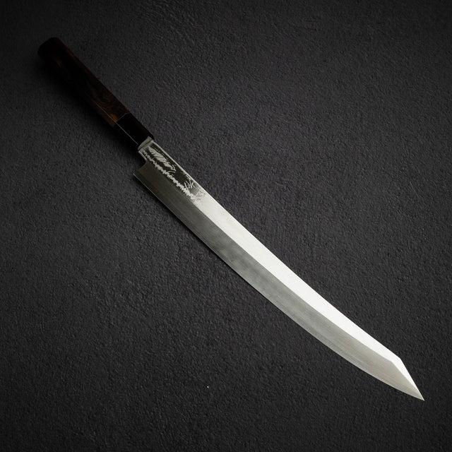 The Yanagiba, often simply called Yanagi, stands as a quintessential knife in the Japanese culinary realm, specifically designed for the artful preparation of sashimi, sushi, and sliced raw fish and seafood. As a member of the Sashimi hōchō family, it is celebrated for its long, slender blade that ensures precision cuts with minimal effort. Blade lengths start at approximately 210mm and can extend up to 360mm, with the 240mm and 270mm sizes being the most favored for home use, while professional kitchens frequently opt for 300mm and larger. This knife's design is not just about aesthetics but about fulfilling the precise requirements of Japanese cuisine, making it a vital tool for both amateur and seasoned chefs.
