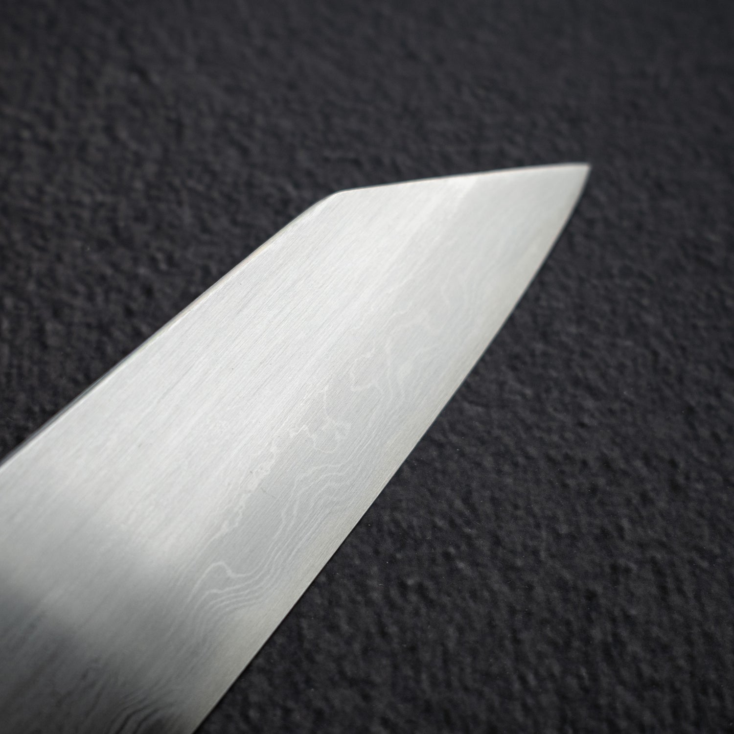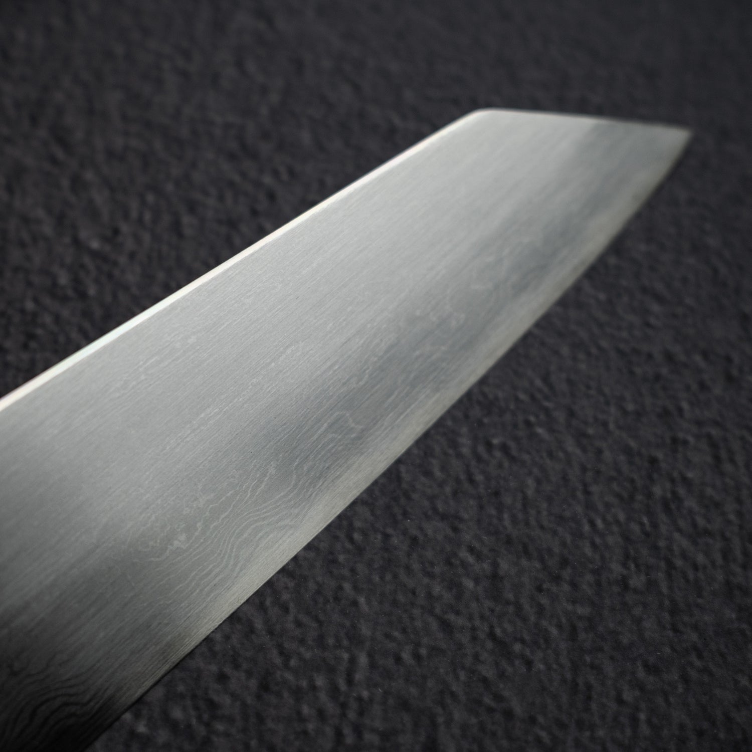 Compare to the wide bevel finish, there are no distinct shinogi lines between the Hira and the primary bevel. The geometry transitions smoothly from the spine to the edge. In my opinion, this is a better way to enjoy the Damascus pattern, as they can flow along the blade without the interruption by the change in finishing pattern that is used to create the wide bevel look.