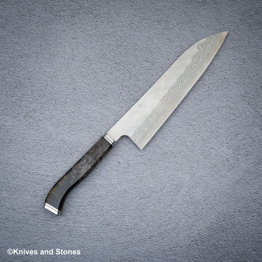 This is how the handle will look like when installed: a 210mm Gyuto with a corresponding handle from the series.