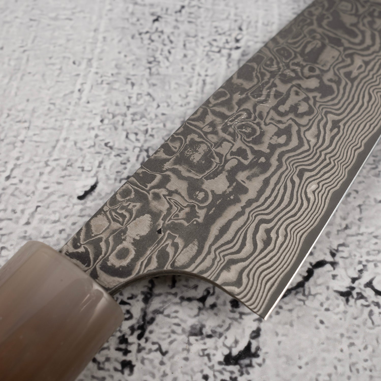 The soft cladding enables the thinning process to be a lot easier than a honyaki or monosteel construction. However, when the cladding is made of damascus, whether etched, polished or mirror polished, the thinning process will take a toll on the cladding, meaning the damascus won't look the same as when it was taken out of the box.