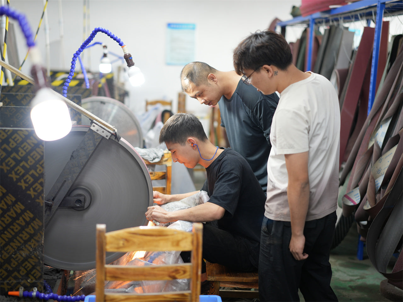 They are also great solutionmakers that fully leverage the industry that China has to offer. You could see in their factory the gigantic contact wheel that is made to match the Japanese grinding stone, which they made custom order for to repair the concavity of the single bevel knives. They would also develop their own abrasive solutions just to finish their knife with a certain look with better consistency and speed. Due to their need to deal with high alloy powder steel all the time, they even made their own diamond stone. This is a group that has ambition in their product and a skill set to match it. Their motto says it pretty well: Don’t just be content with high proficiency in foreign and polishing, but seek the expression of different products.