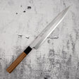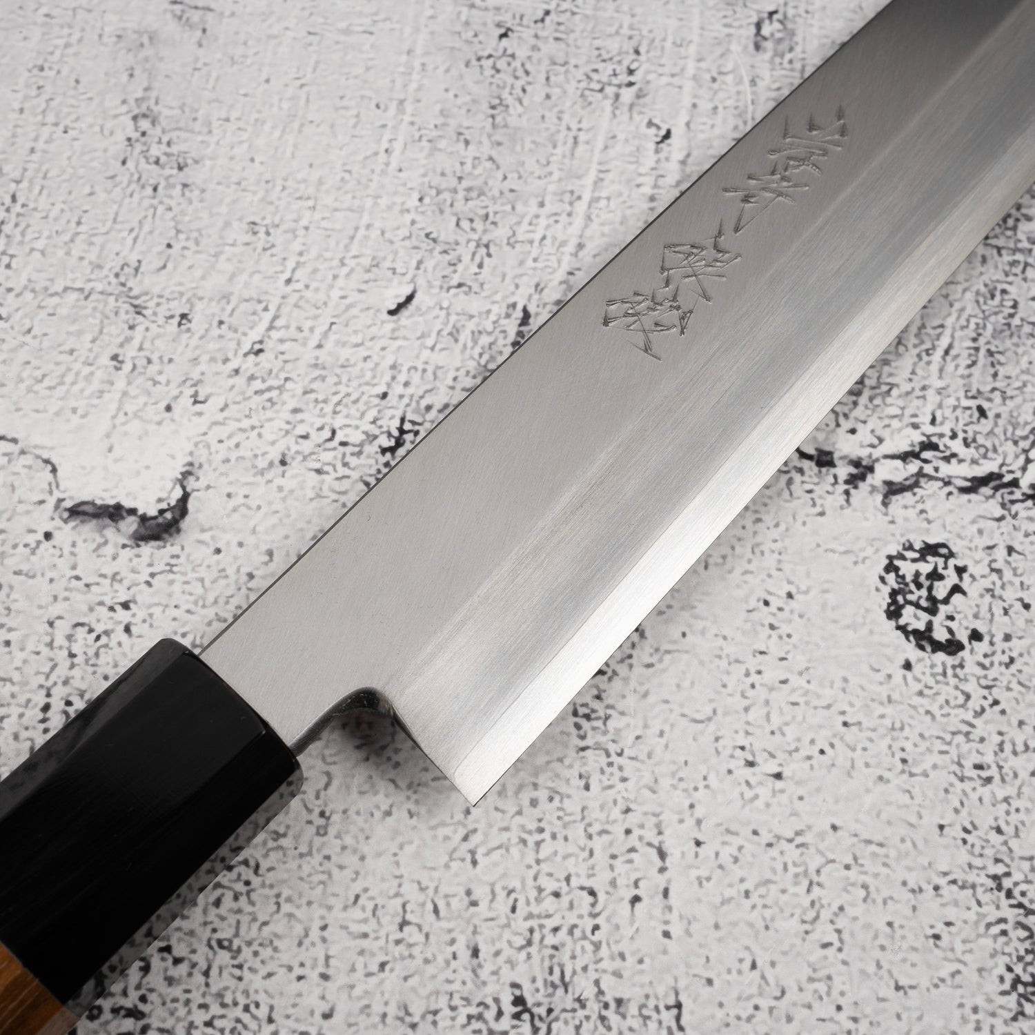 The Yanagiba, often simply called Yanagi, stands as a quintessential knife in the Japanese culinary realm, specifically designed for the artful preparation of sashimi, sushi, and sliced raw fish and seafood. As a member of the Sashimi hōchō family, it is celebrated for its long, slender blade that ensures precision cuts with minimal effort. Blade lengths start at approximately 210mm and can extend up to 360mm, with the 240mm and 270mm sizes being the most favored for home use, while professional kitchens frequently opt for 300mm and larger. This knife's design is not just about aesthetics but about fulfilling the precise requirements of Japanese cuisine, making it a vital tool for both amateur and seasoned chefs.