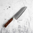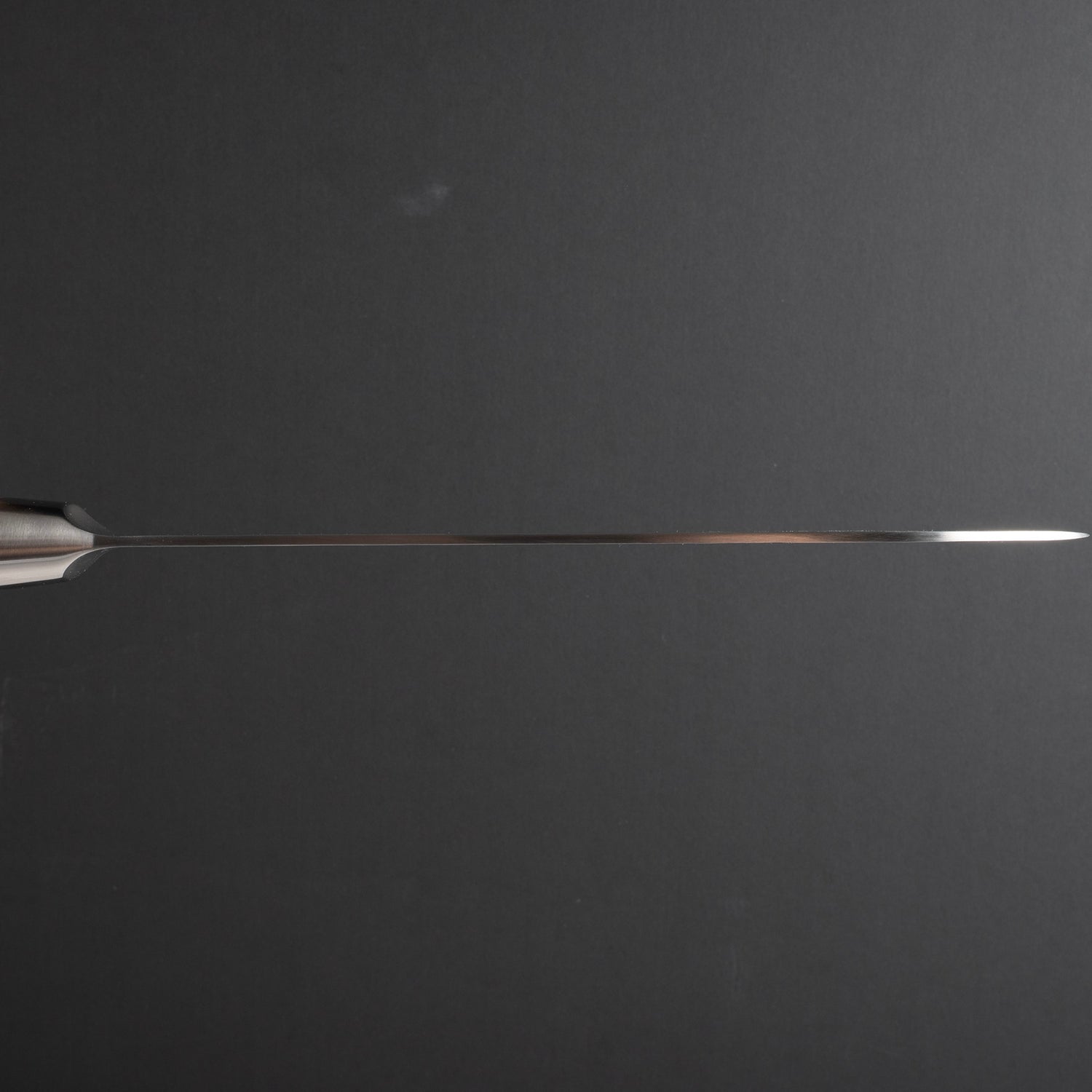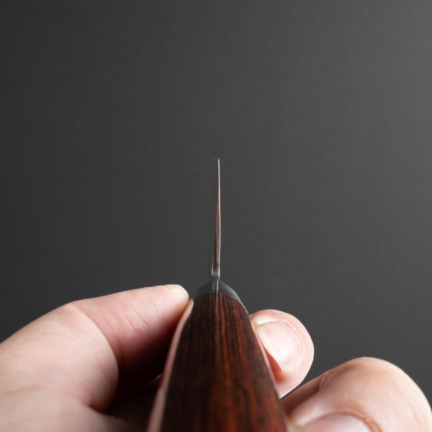 The San line perfectly combines elegance with utility. 3 Layer (sanmai) construction, with VG5 core heat treated to a perfect hardness of HRC 61, giving the knife a very strong edge retention. The bevel is hand sharpened and polished by hand, giving the edge an unmatched sharpness.