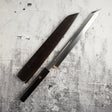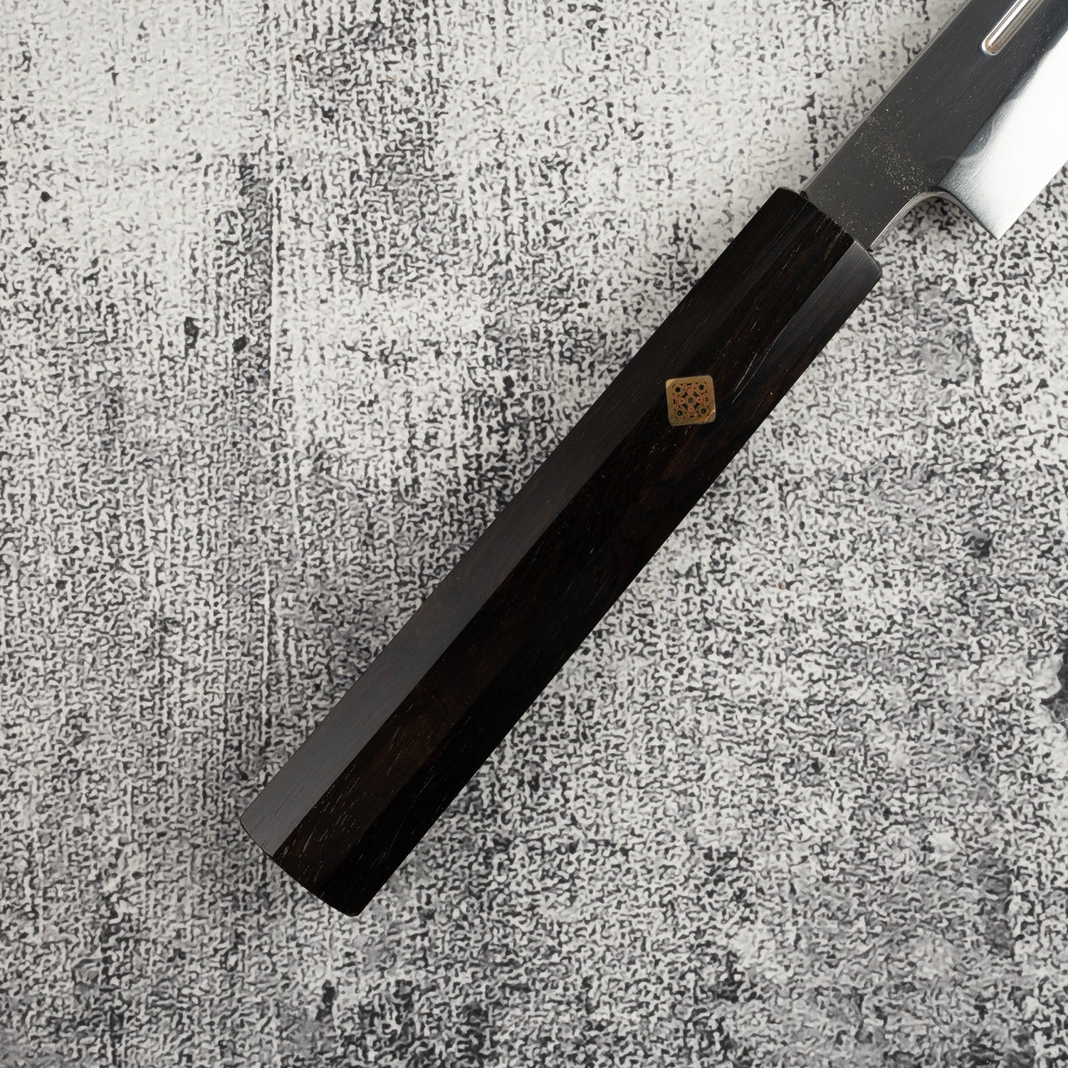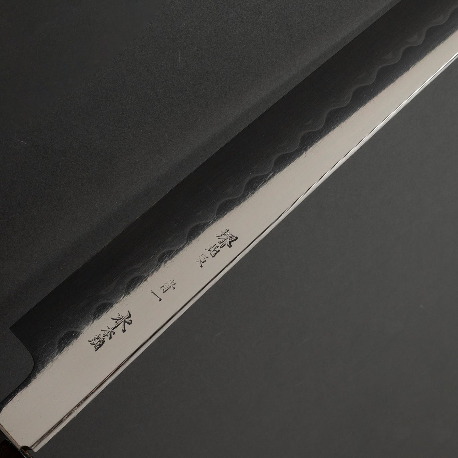 Hand-forged from Aogami #1 carbon steel and hardened to an exceptional HRc 63–65, it offers outstanding edge retention and an incredibly smooth, precise cut — the kind sought after by the most skilled sushi chefs. The mirror-polished surface reveals subtle steel banding beneath, while the traditional mizu-honyaki quench unveils a soft, mist-like hamon that showcases Ikeda’s remarkable heat-treatment control.