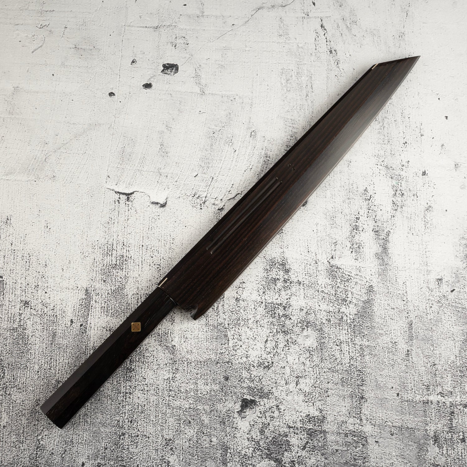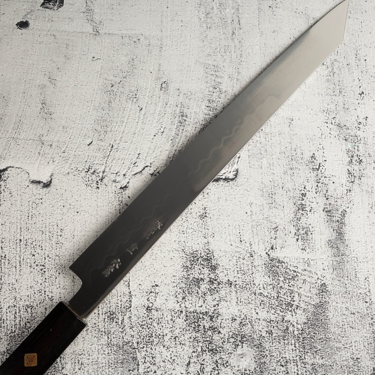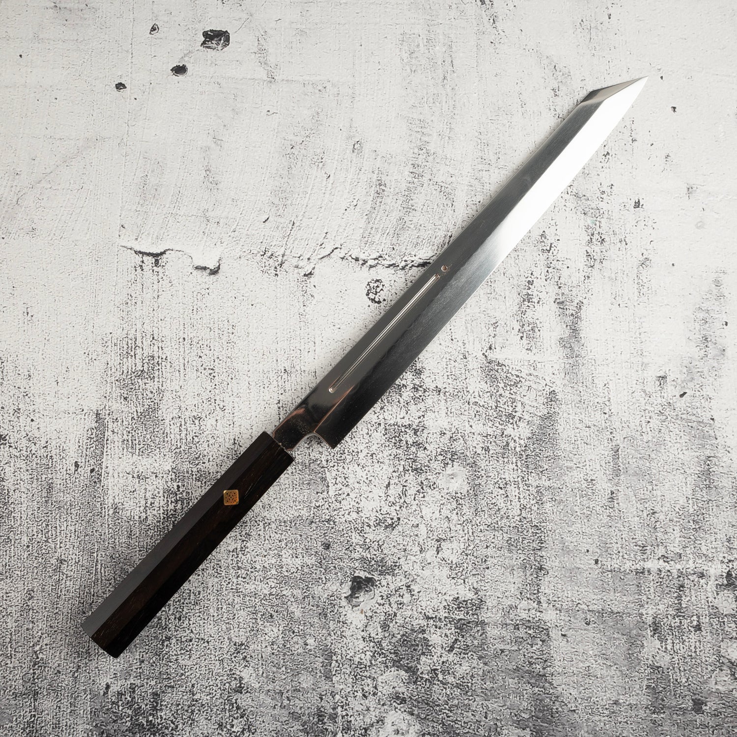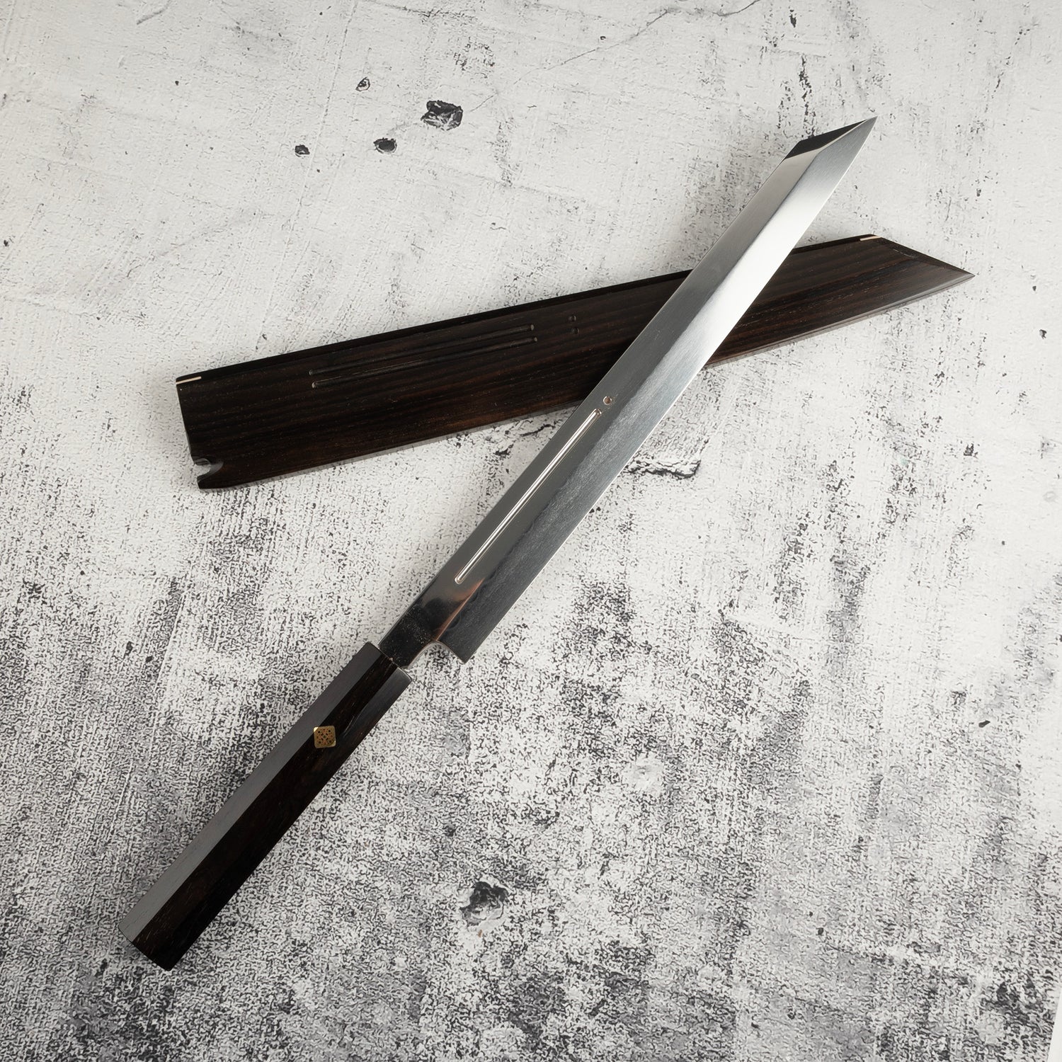 Exotic: Yoshikazu Ikeda Blue #1 Mizu-Honyaki K-tip Yanagiba 300mm with Blood Groove Ebony Set