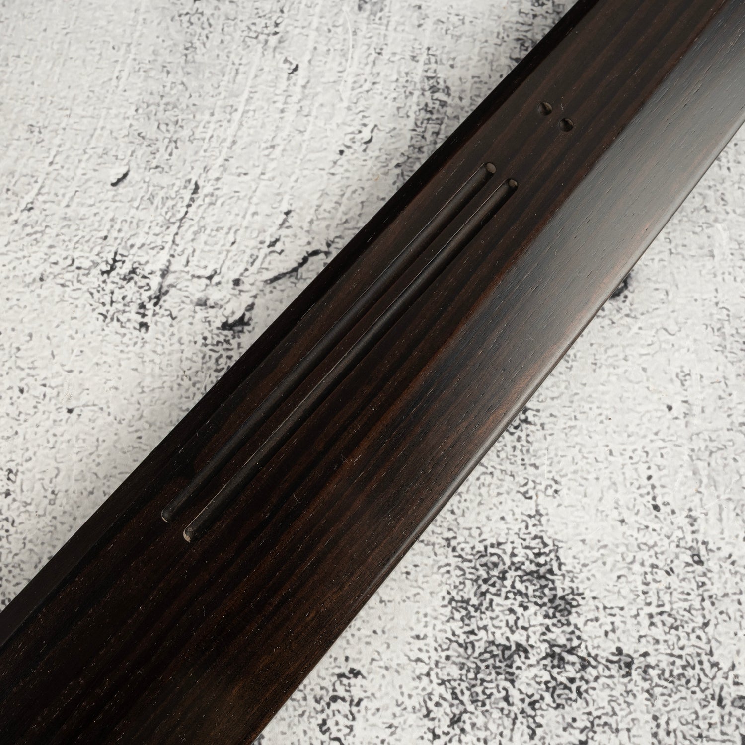 Enhancing its beauty is a graceful bohi (fuller or blood groove), a refined detail rooted in classic Japanese swordcraft. This piece is paired with a matching ebony wood saya and octagonal handle, both precisely crafted from dense, jet-black hardwood that adds a sense of quiet luxury and timeless elegance.