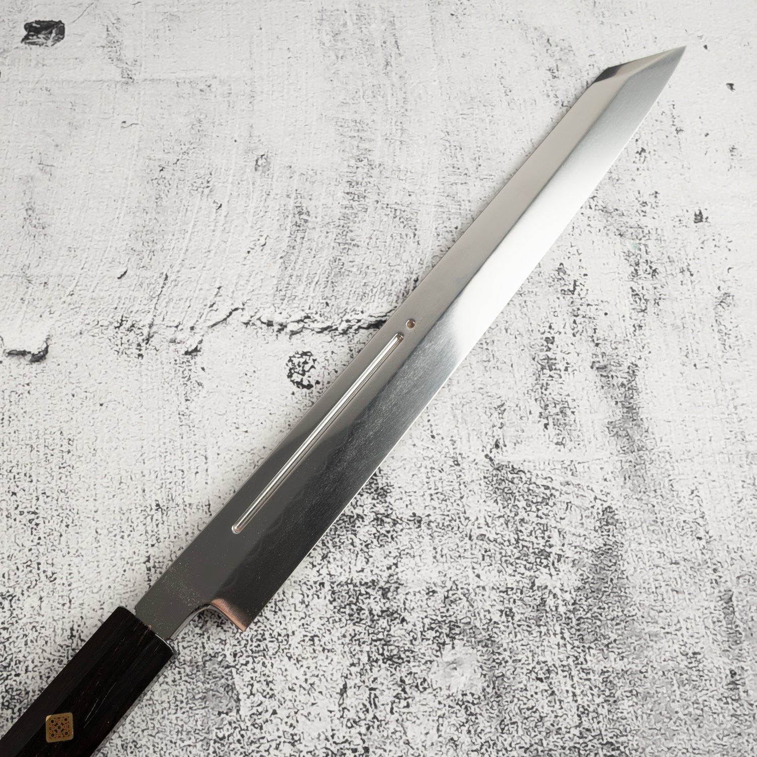 Exotic: Yoshikazu Ikeda Blue #1 Mizu-Honyaki K-tip Yanagiba 300mm with Blood Groove Ebony Set is backordered and will ship as soon as it is back in stock.