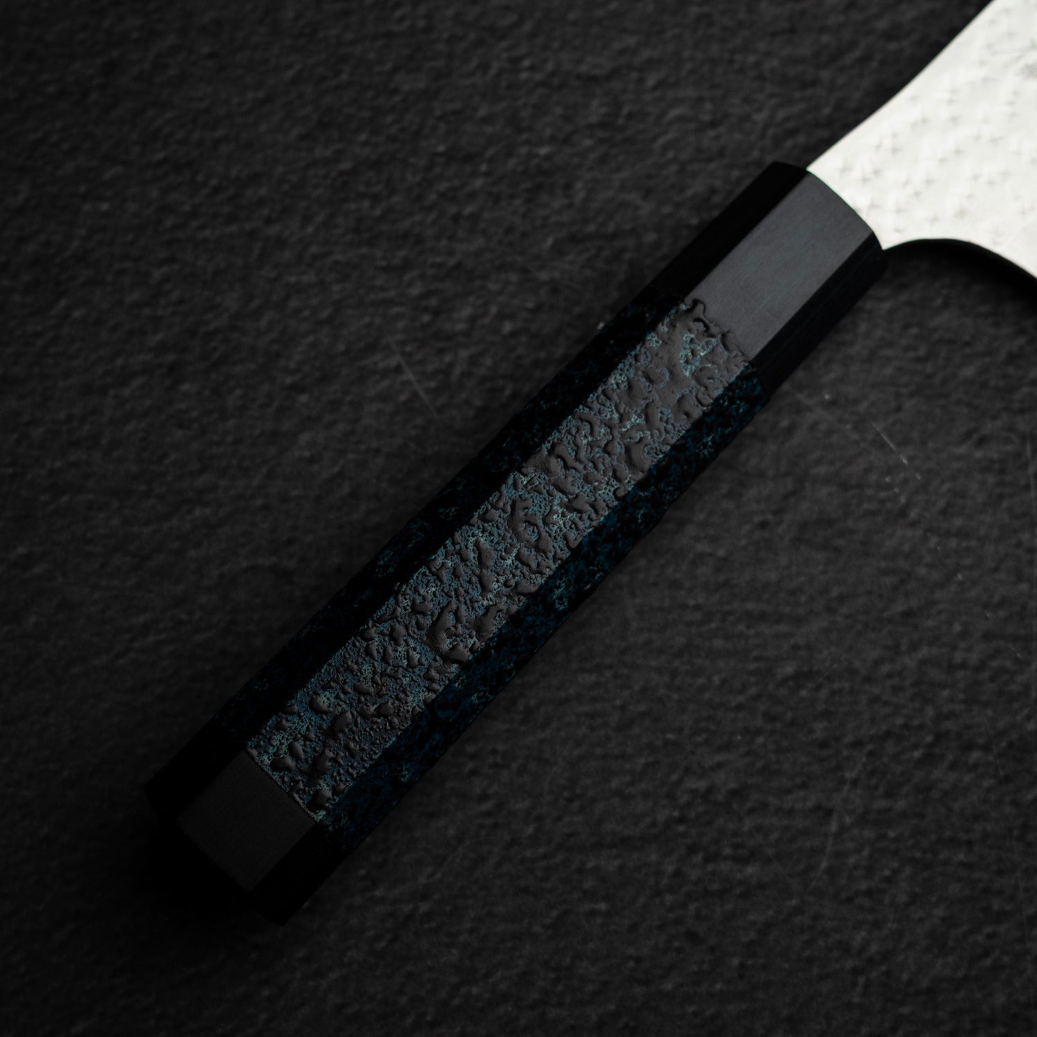 What truly distinguishes this Ai Tenmoku edition is its extraordinary handle and matching saya. Crafted from natural wood, they are carefully dyed using Ai-zome—a traditional Japanese indigo dyeing method performed by skilled artisans. The process carries a high yield loss, making each finished blue piece rare and highly valuable. Additional techniques such as Kanshitsu (traditional Urushi lacquering) and Tenmoku—inspired by classical Japanese pottery glazing—add depth, texture, and durability.