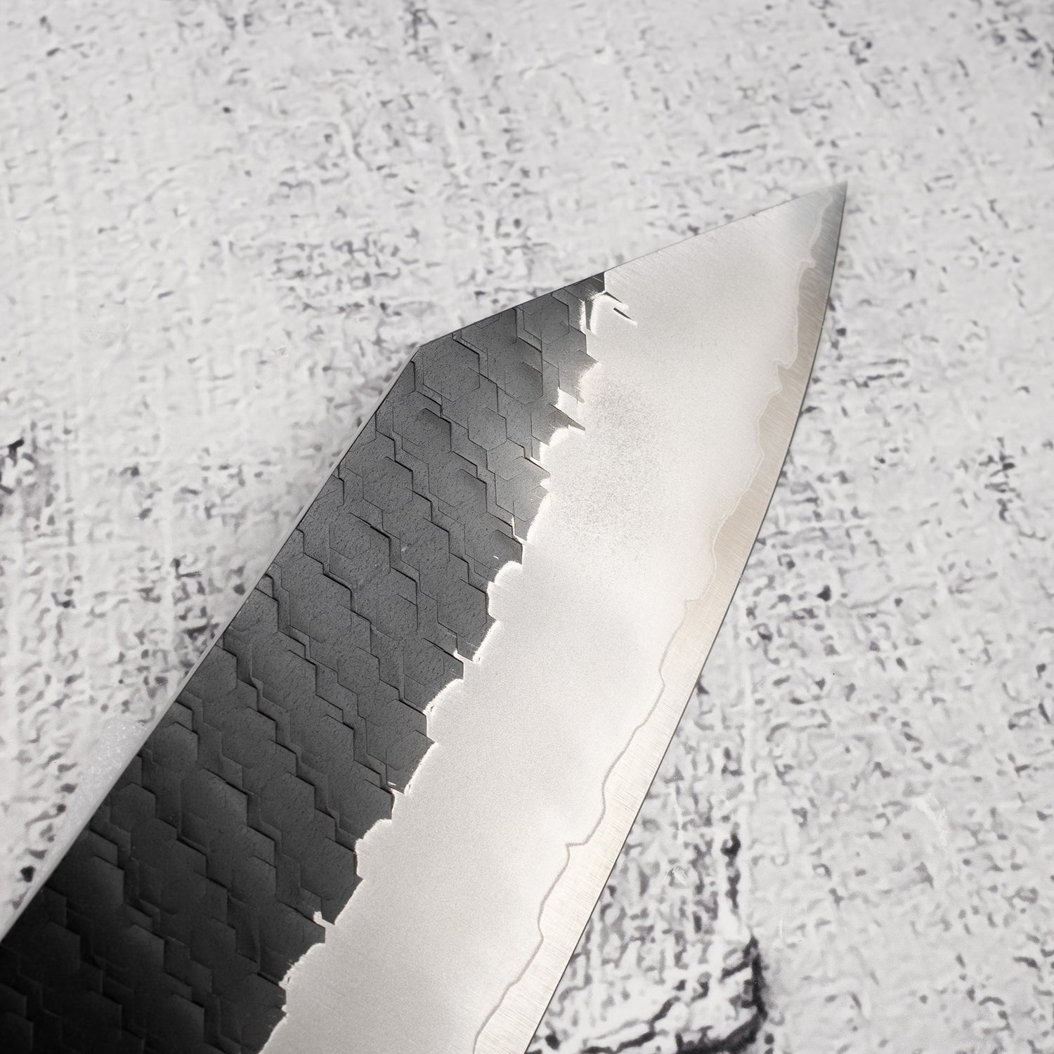 Kurouchi refers to the rustic, unpolished finish found on the blade of many traditional Japanese kitchen knives. This blacksmith's finish is characterized by its dark, textured appearance, which is the result of leaving the blade forge-scale on the steel during production. Kurouchi finish not only adds a unique aesthetic appeal but also provides certain practical benefits. It acts as a protective layer against rust and corrosion, and helps to reduce food sticking to the blade during cutting. Commonly seen on high-quality, hand-forged knives, the kurouchi finish emphasizes the artisanal nature of the knife and its heritage, making each piece distinctively unique.