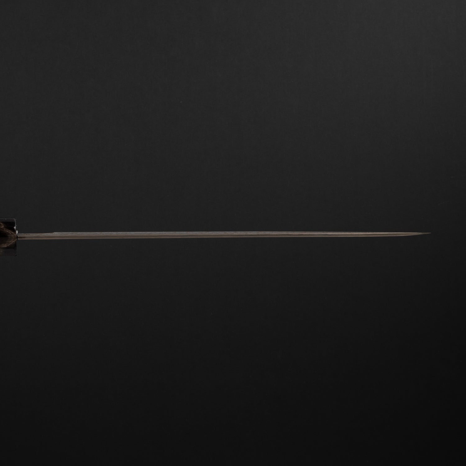At 210mm, this gyuto provides an ideal balance between versatility and maneuverability, excelling in slicing, chopping, and precision tasks. A slim, tapered spine enhances cutting efficiency, while the generous blade height ensures comfortable knuckle clearance. The handle is crafted from rich ebony wood, paired with a natural horn ferrule and a single metal spacer, offering both durability and understated elegance. Combining practicality with artistry, it embodies Takeshi Saji’s signature craftsmanship.