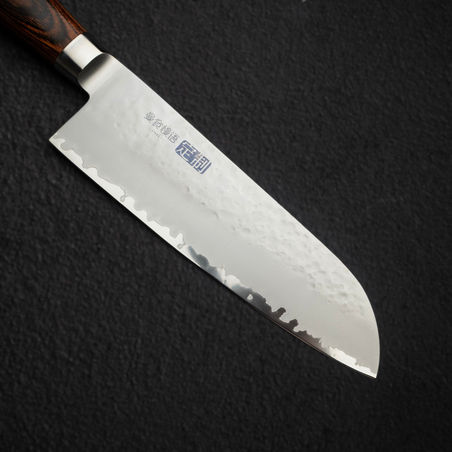 The outer layers are comprised of soft stainless steel that was given a beautiful hammered matte finish. Combined with a stabilized wood handle, integrated bolster, the Tamahagane San is a prefect addition to the kitchen.