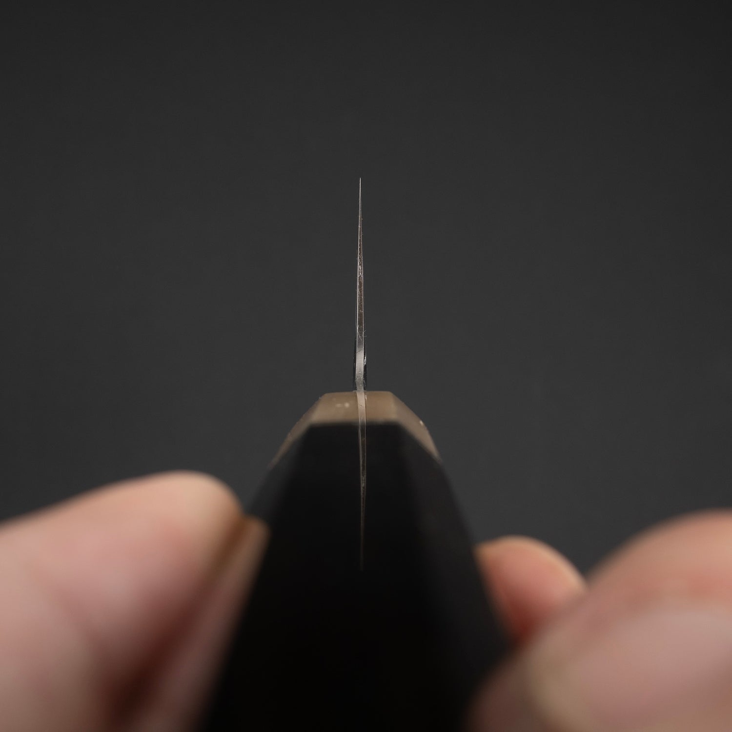 Discover the exceptional Tetsujin Ginsan Tanryusen (Metal Flow) Gyuto 210mm, a premium Japanese kitchen knife crafted by master sharpener Naohito Myojin of Myojin Riki Seisakusho. This outstanding Japanese kitchen knife features Ginsan (Silver #3) stainless steel hardened to 60-62 HRC, offering the sharpness and fine grain structure of carbon steel with superior corrosion resistance. The blade showcases a beautiful metal flow pattern and precise double bevel geometry with measurements of 201mm edge length, 46mm heel height, and spine thickness tapering from 2.5mm at the heel to 0.6mm at the tip. Weighing just 156g, this Japanese kitchen knife provides perfect balance and effortless cutting performance. The handle features minimalist octagonal ebony construction, meticulously milled from a single block and highly polished for a luxurious grip. As a versatile Gyuto profile, this Japanese kitchen knife excels at slicing, dicing, and chopping vegetables, meats, and more. Each Japanese kitchen knife in the Tetsujin line represents the pinnacle of craftsmanship from the sharpener behind renowned Konosuke Fujiyama knives.