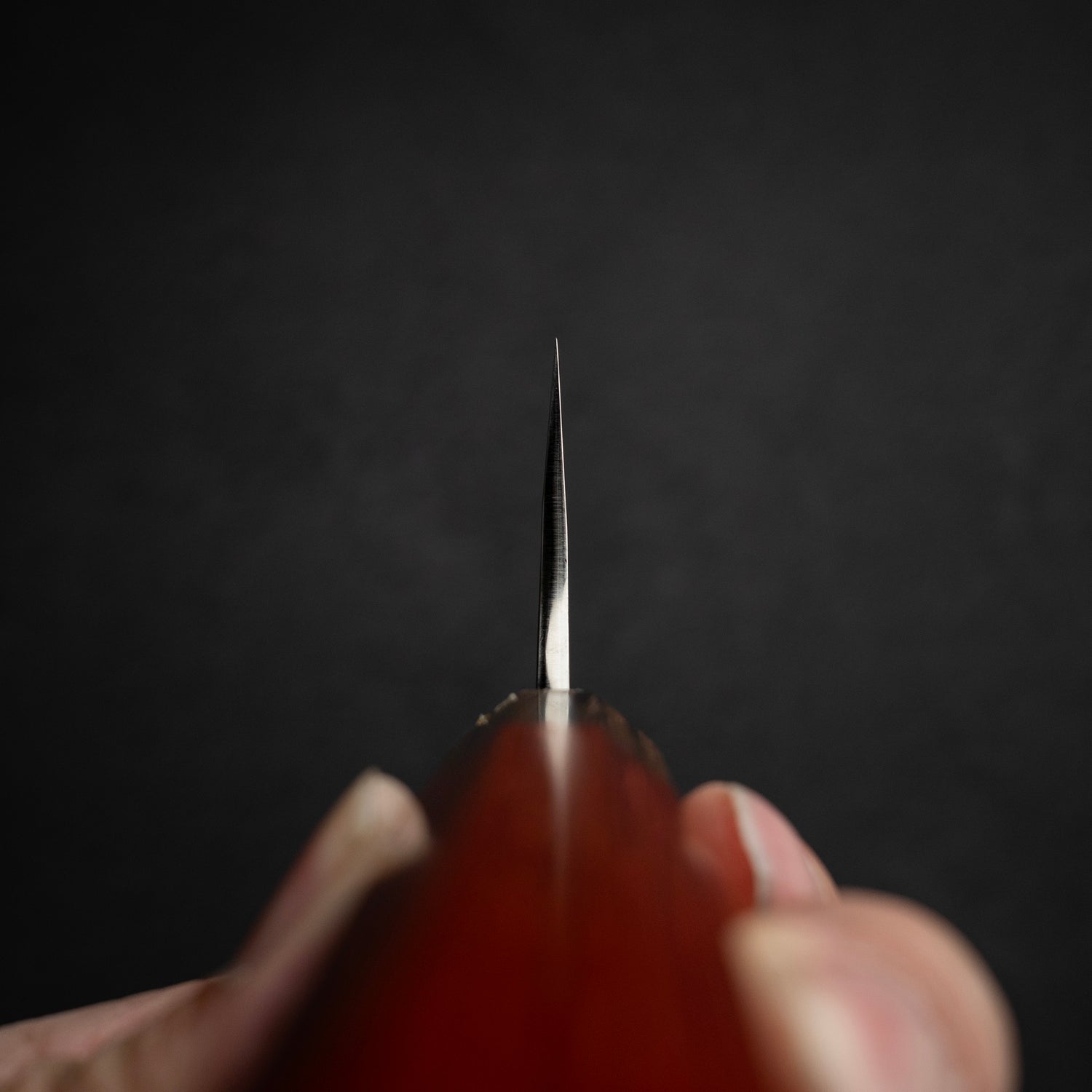 The SG2 Shizuku line by Yu Kurosaki combines advanced powdered steel performance with true hand-forged craftsmanship. Each blade is individually forged and shaped in Echizen, giving it a lively, organic feel that stamped knives simply cannot replicate. A pronounced distal taper from the choil to the tip creates a knife that feels solid and powerful at the heel while becoming thin and precise toward the tip, delivering both strength and finesse in every cut.