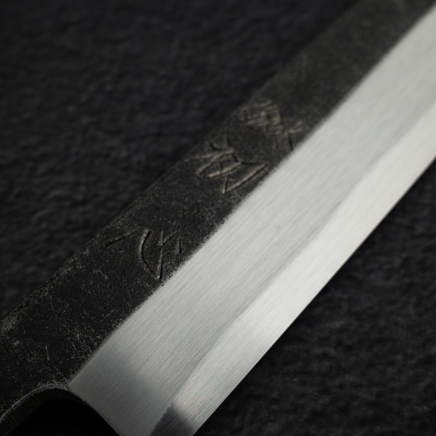 Kurouchi Tsuchime 是結合原始黑皮與充滿個性的槌目處理。常見的Kurouchi(黑打)工藝會保留鍛造後的黑色氧化層與鍛造紋理,讓刀身呈現各種獨特紋路與凹痕。Kurouchi與Tsuchime的結合不僅美觀,也兼具實用:減少阻力、幫助食材脫離並保護鋼材不易生鏽。總體而言,Kurouchi Tsuchime 是兼具實用性與美感的獨特刀面處理。