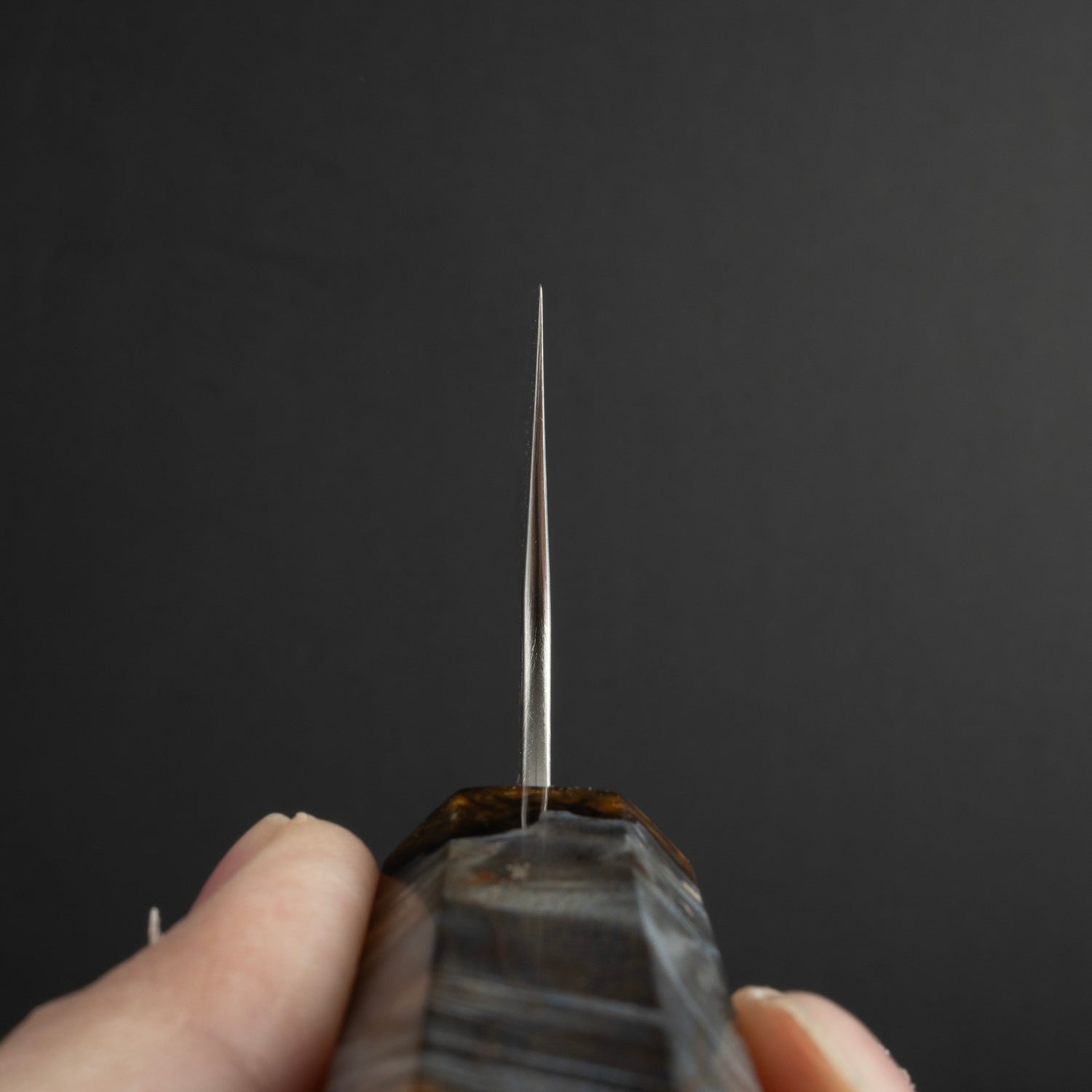 HYO 系列採用加藤標誌性的槌目處理,全程以手工細緻敲打而成。這種獨特的紋理不僅視覺上醒目,也具備實用功能,有助於減少阻力並讓食材在每一次切割時更容易脫離刀面。介於細膩與剛勁之間,這些刀並非用來一眼驚豔,而是隨時間累積信任。它們是為那些重視精準、節奏與職人操守的料理人而生的工具。