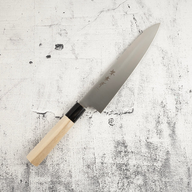 這款「堺孝行 Inox 日本主廚牛刀」以及同系列的「堺孝行 Inox 雙面刃」刀款,是適合每日使用的可靠日本廚刀,產自擁有數百年鍛刀歷史的大阪堺地區。「Inox」一名指的是不鏽鋼結構,旨在在抗鏽性、易於保養與日常實用性能之間取得平衡。這系列刀具硬度約為 57–59 HRC,在維持良好持鋒性的同時,比高硬度碳鋼或粉末鋼更容易研磨,也較不脆。